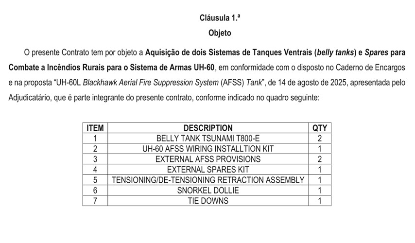 Contrato para a aquisição de 2 tanques ventrais para os UH-60L e sobresselentes, adjudicado à firma Recoil Aerospace Inc. por 1 milhão e meio de euros.