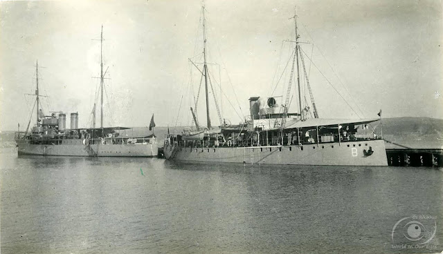 "NRP Beira", 1918. A Canhoneira quando regressou a Cabo Verde vinha pintada com camuflagem de combate, por estar integrada na Divisão de Defesa dos Açores. Aguarela de Fernando Lemos Gomes (2010), pintor madeirense, integrado num conjunto de trabalhos comemorativos da implantação da República, 1910.