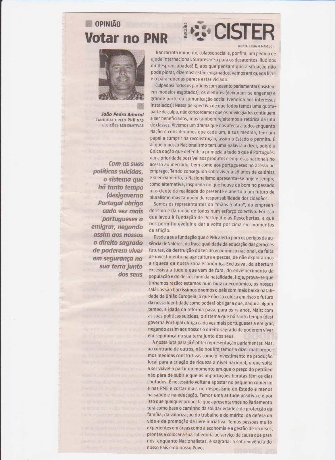 Não sou do PNR. Simpatizo apenas com as ideias deles. Não tenho sequer partido. Apenas alterno entre a preferencia ao CDS ou PNR (ou outro que apareça, sem grandes extremismos. Havia um penso de nome Partido Liberdade, PL. Infelizmente, por alguma razão, a politica dominada pelos Socialistas, não aceitaram este novo partido de direita....deviam ter medo e queriam só um, já com a imagem estragada).